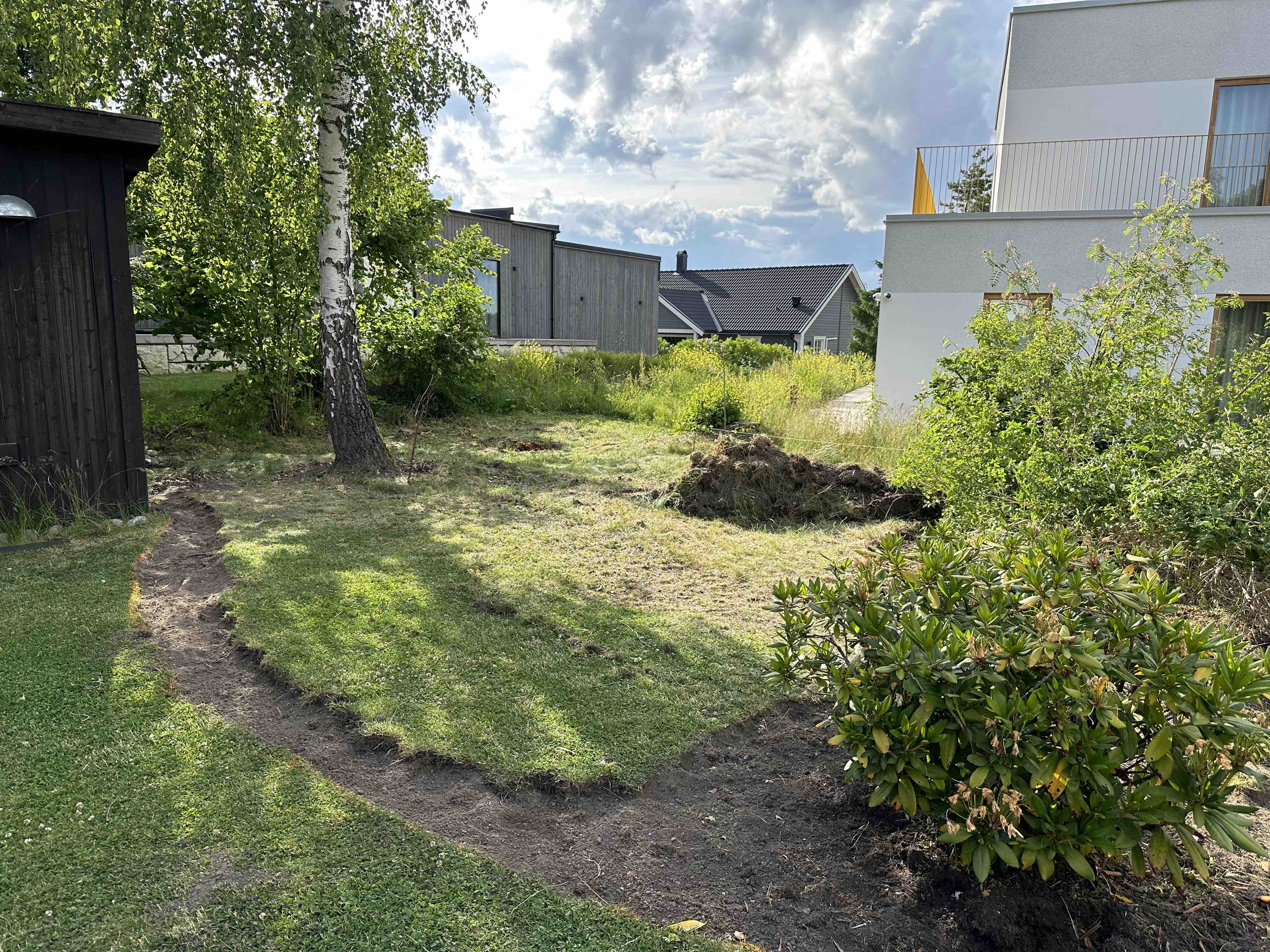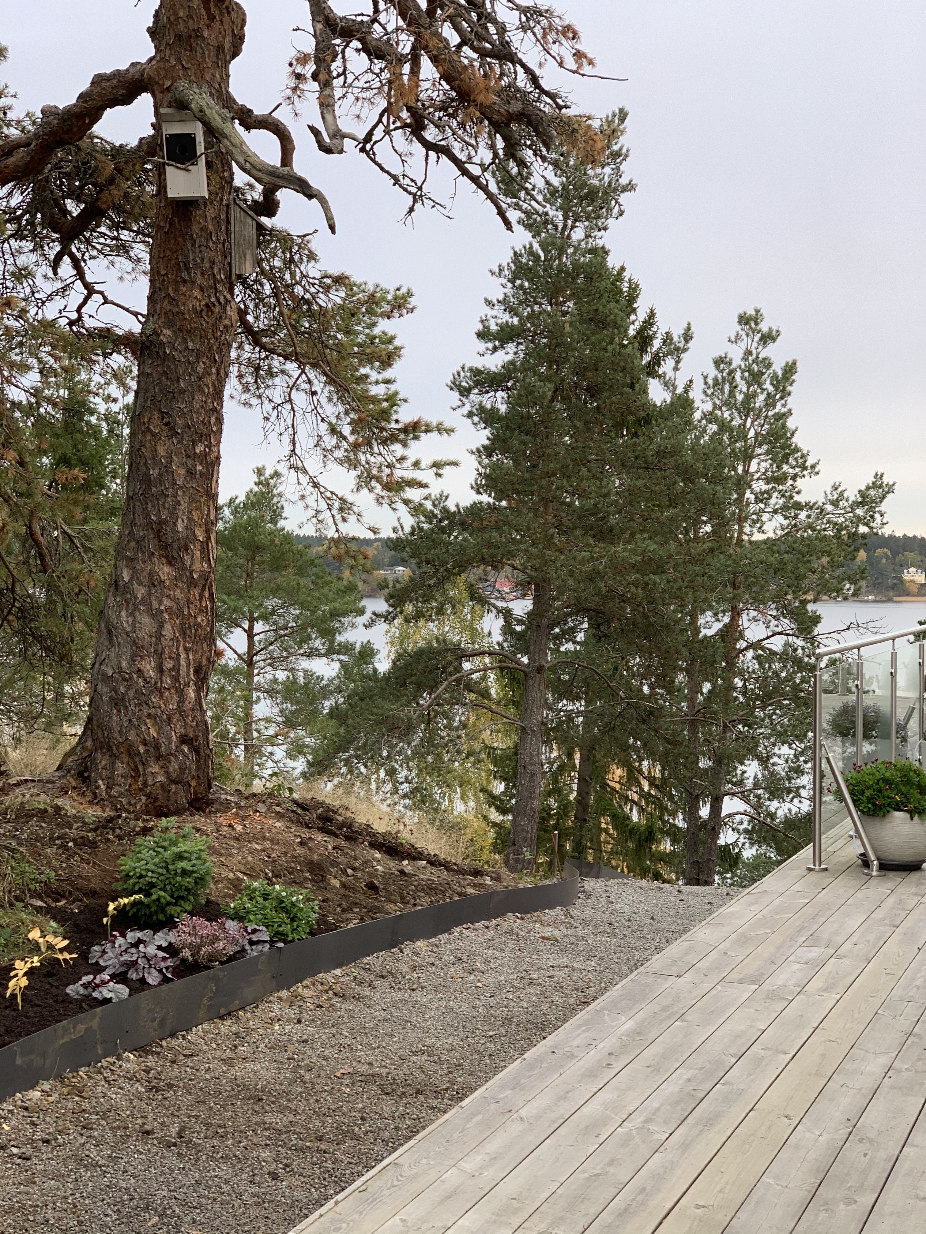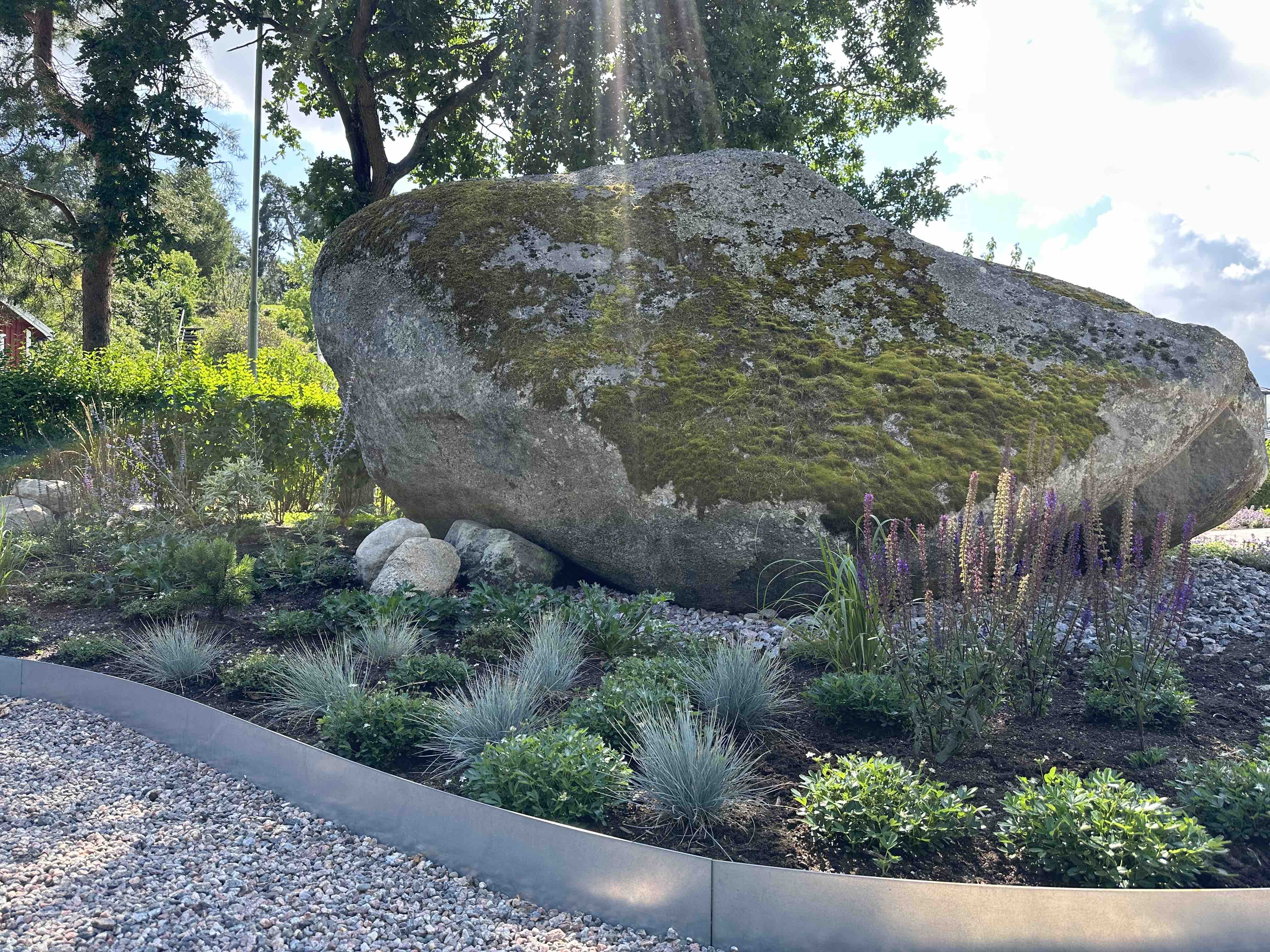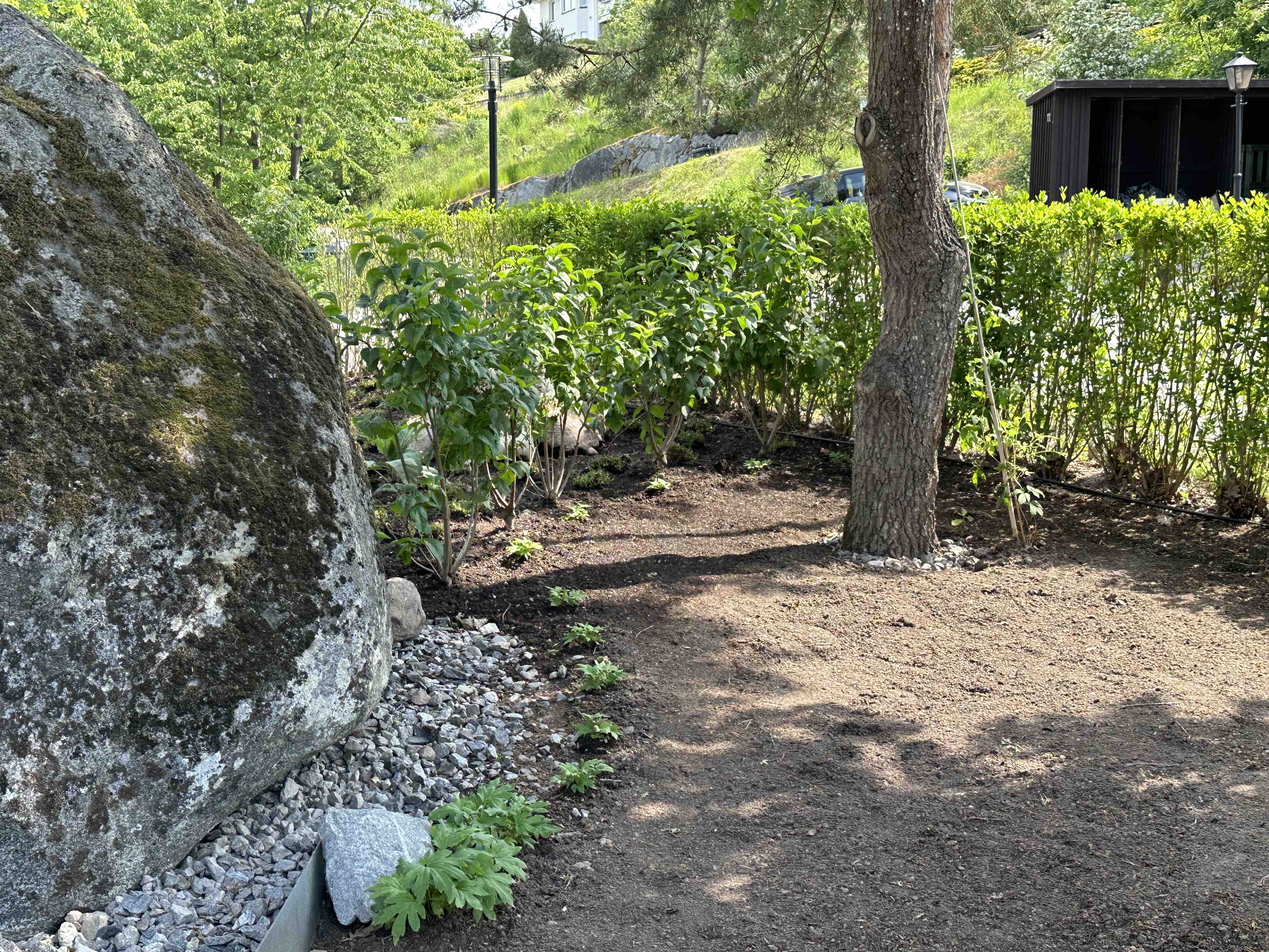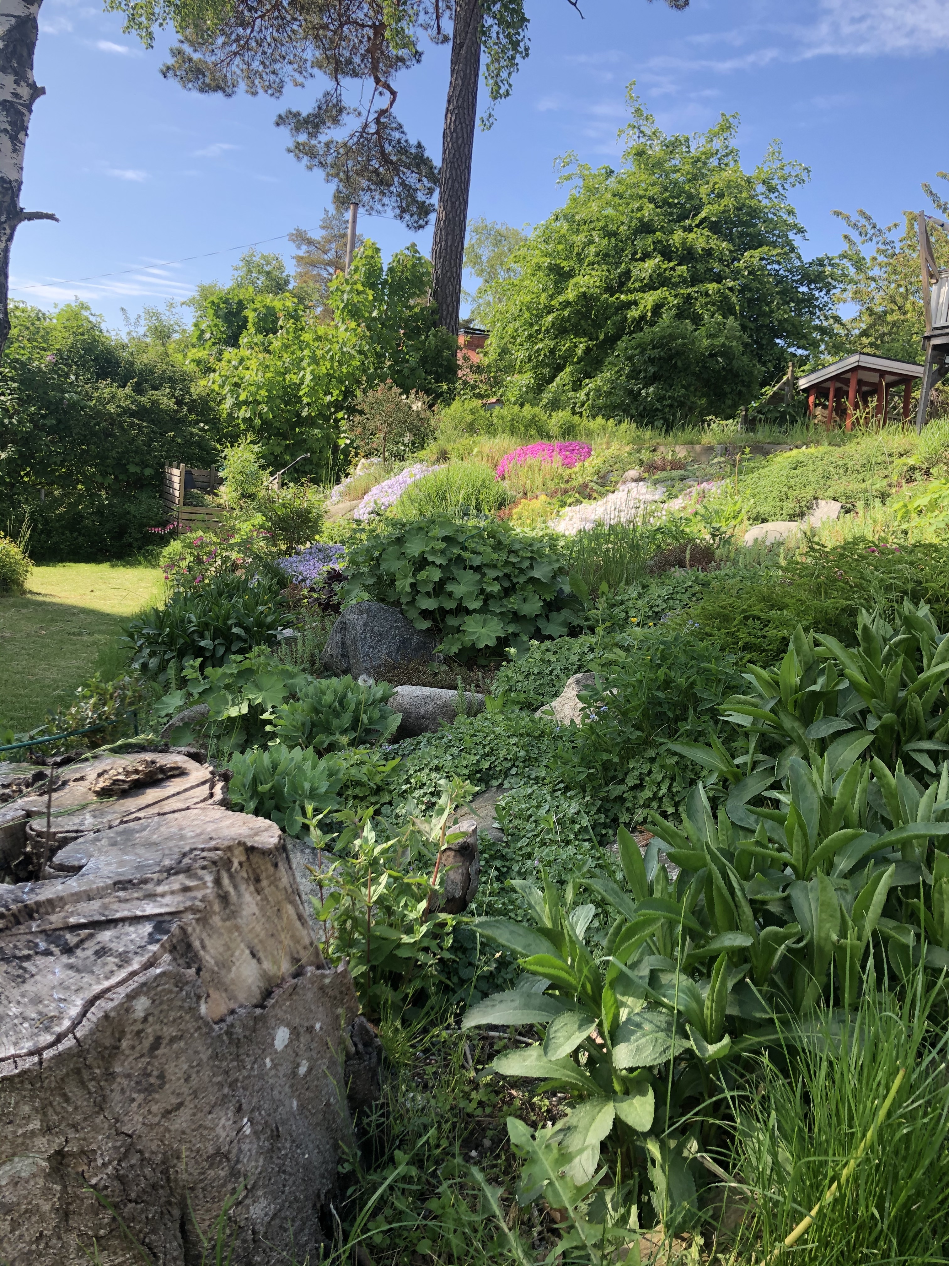 Ibland kan en tomt bli lite övermäktig och det är svårt att veta var och hur man ska börja. Här började vi med att rama intomten med en häck, valet blev aronia som är ursnygg på hösten, får nyttiga bär och ger oss här en mjuk övergång till allmänningen och skogen. Det blev en hel del rensning, det flyttades stenbumlingar och grusgången fick sig ett rejält ansiktslyft. Perennerna och gräsmattanvar på plats innan sommaren och semester tog vid.