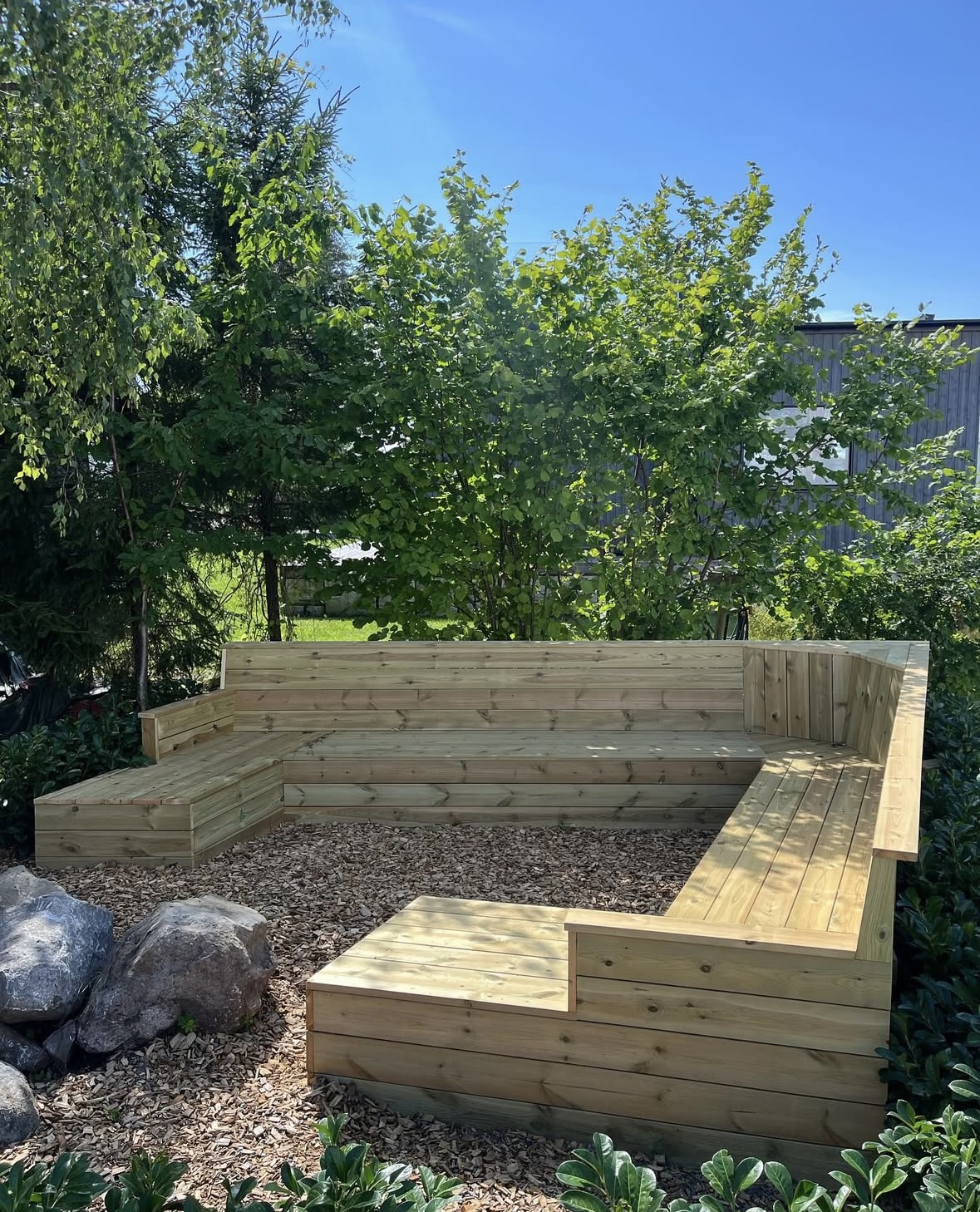 Längst in i hörnet, lite undangömt skapades en mysig plats att hänga. Här kan man vara för att få vara lite i fred, för barn att busa eller att hänga runt eldningspiten på kvällen. Runt om växer det lagerhägg som så småningom skapar ett insynsskydd.