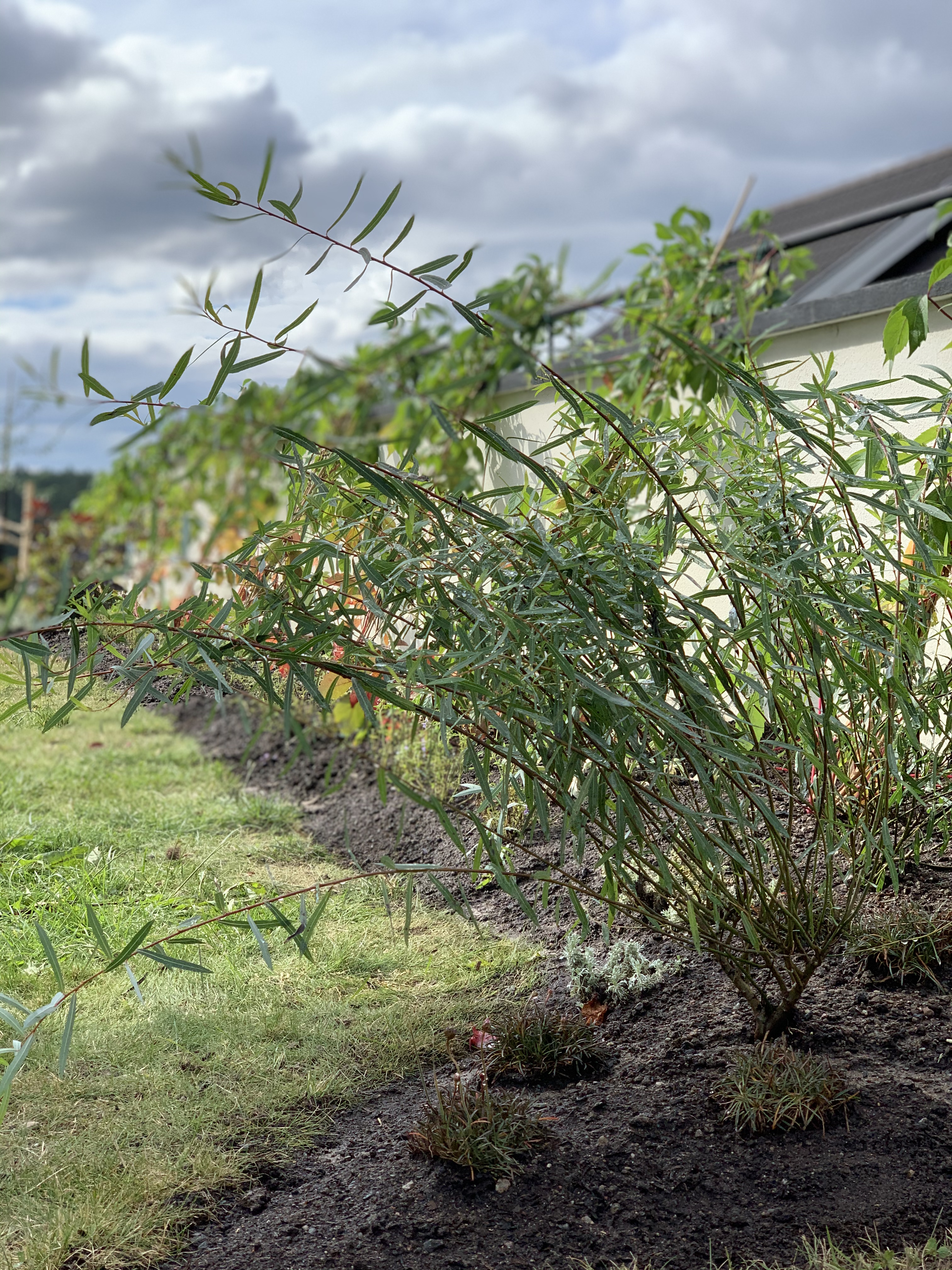 Istället för att fortsätta med häcken (häggmispel) bröt vi av med glansmiskantus för att markera området. Mysiga gångvägar skapades runt öar med perenner, bär, örter och buskar. Det ska vara kul att upptäcka ytan och att se vad som finns att äta. En liten sittyta sparades så att man kan slå sig ner med en kopp kaffe eller för att se på när de andra plockar bär. Flis användes för att täcka marken, ett vackert och effektiv alternativ.