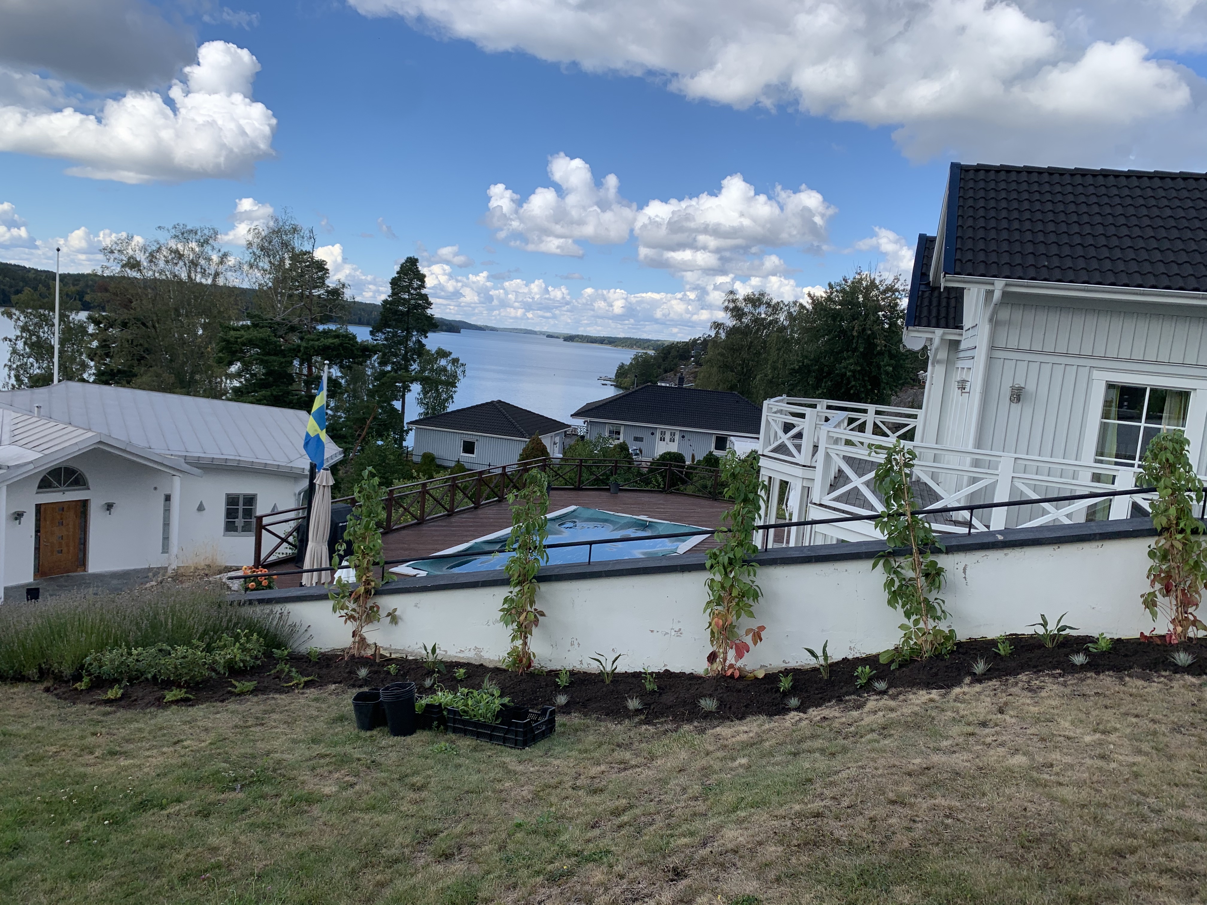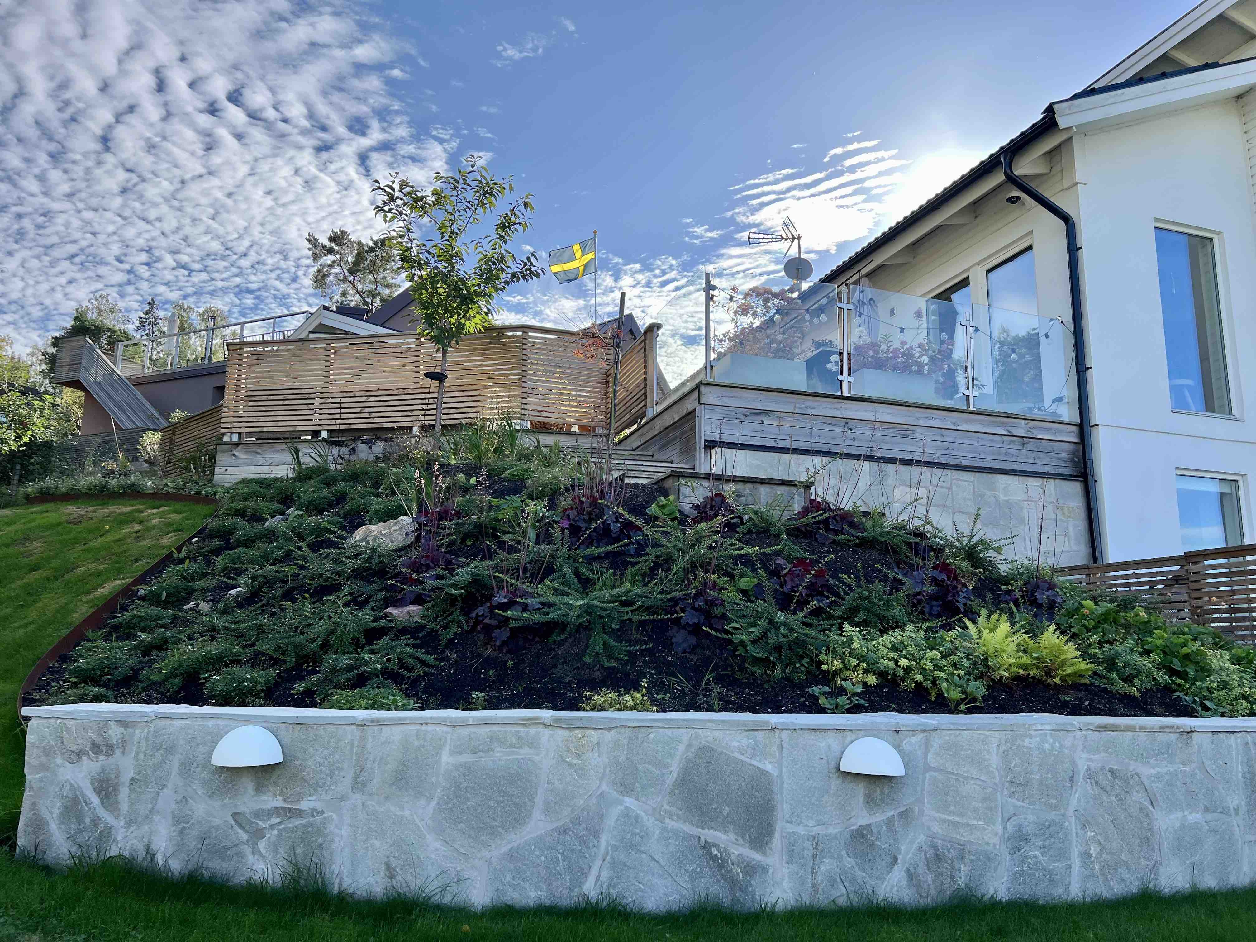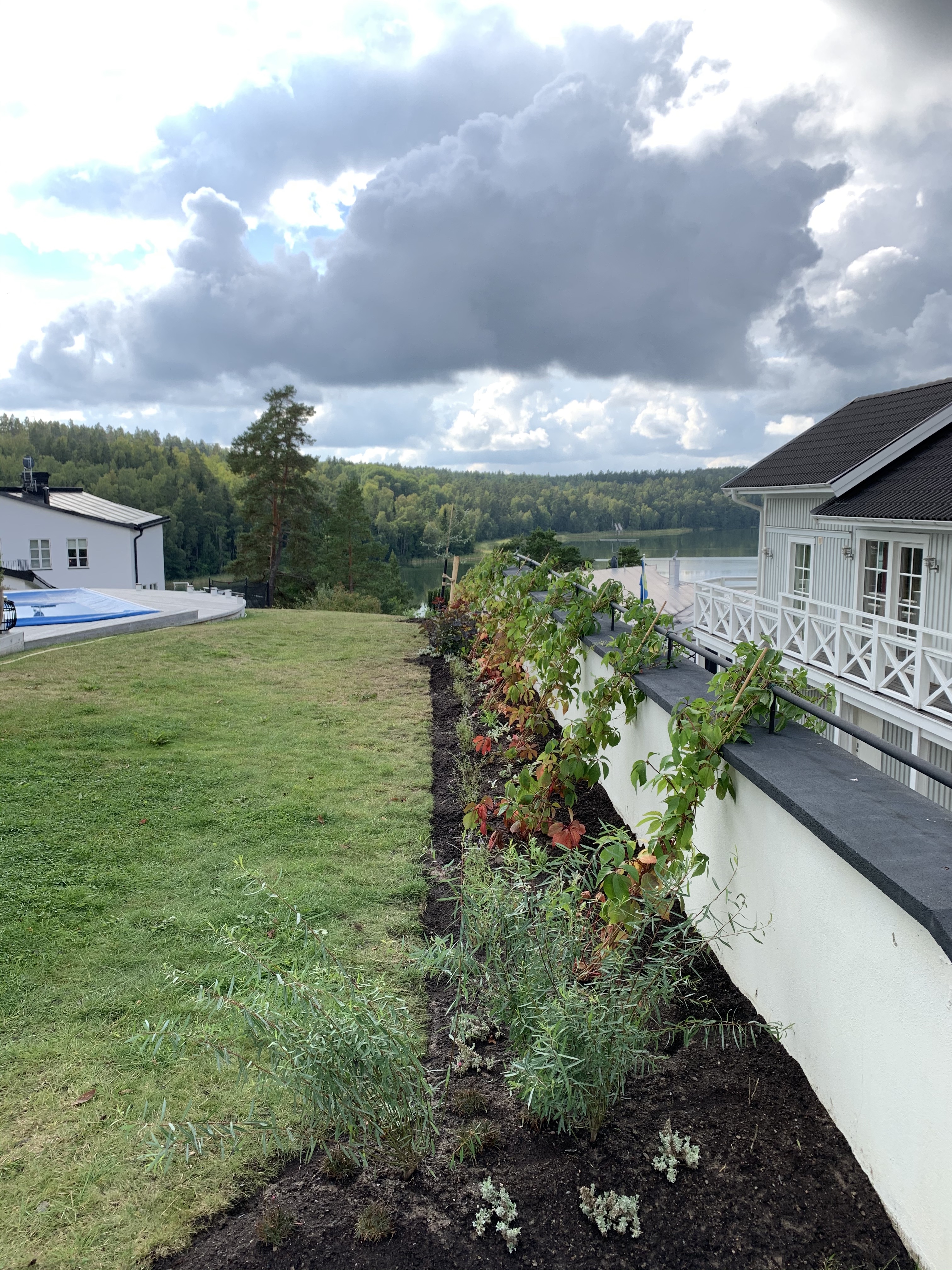Längs med muren i bakkant är vildvin planterat - tanken är att det ska få breda ut sig och hänga över för att tona ner det vita samt bjuda på färgskiftningar över säsongen. Kunden ville behålla en del av gräsmattan så vi har endast gjort några utbuktningar i rabatten för att mjuka upp den och för att det ska "hända lite" i blickfånget från huset och terassen. Växterna är tåliga för sol och vind och förhoppningen är att marktäckarna ska sprida ut sig och täcka jorden så att fukten behålls i större utsträckning samt hålla jorden på plats vid kraftigare regn.