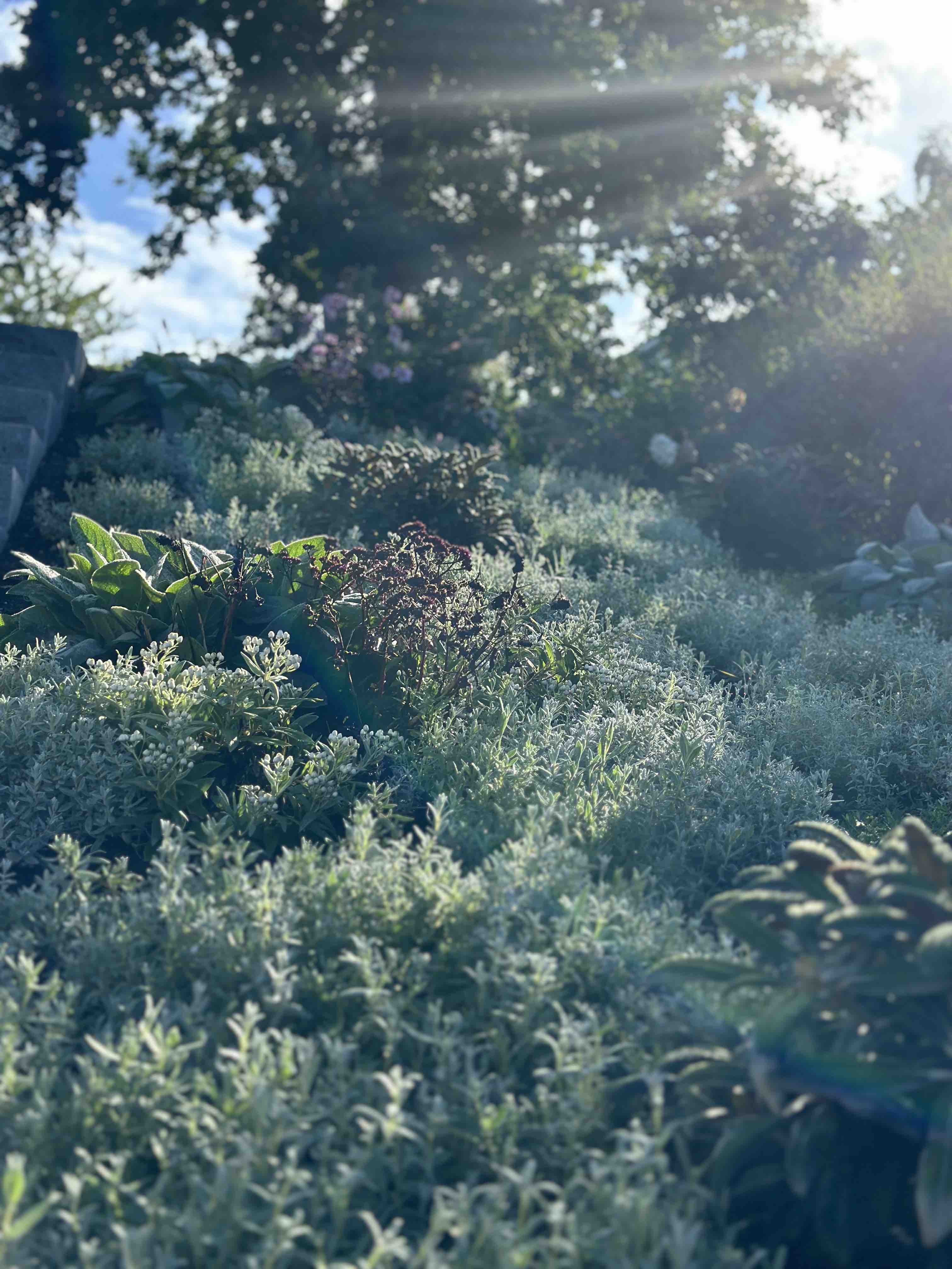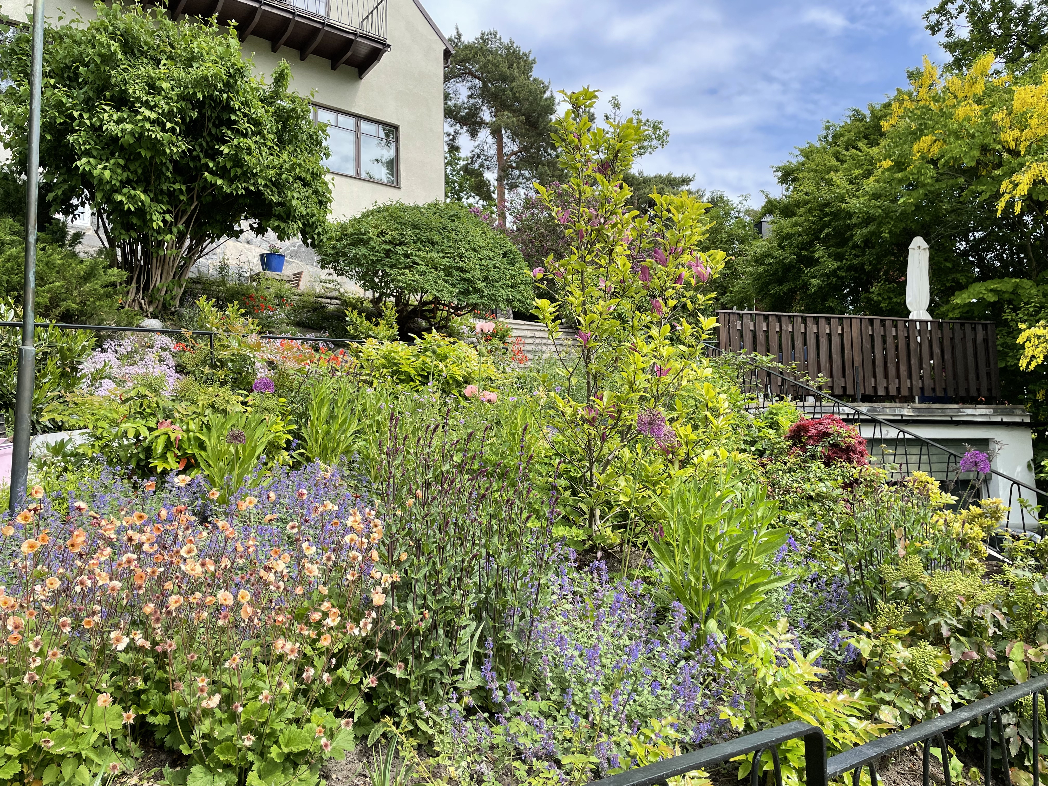 Platsen är öppen och får mycket solljus och på ena sidan finns en trappa med en rabatt i rejäl lutning. Växtvalet bjuder på vintergröna växter som håller jorden på plats och växter som tar vid varandra över säsong. Och det SURRAR bland perennerna!