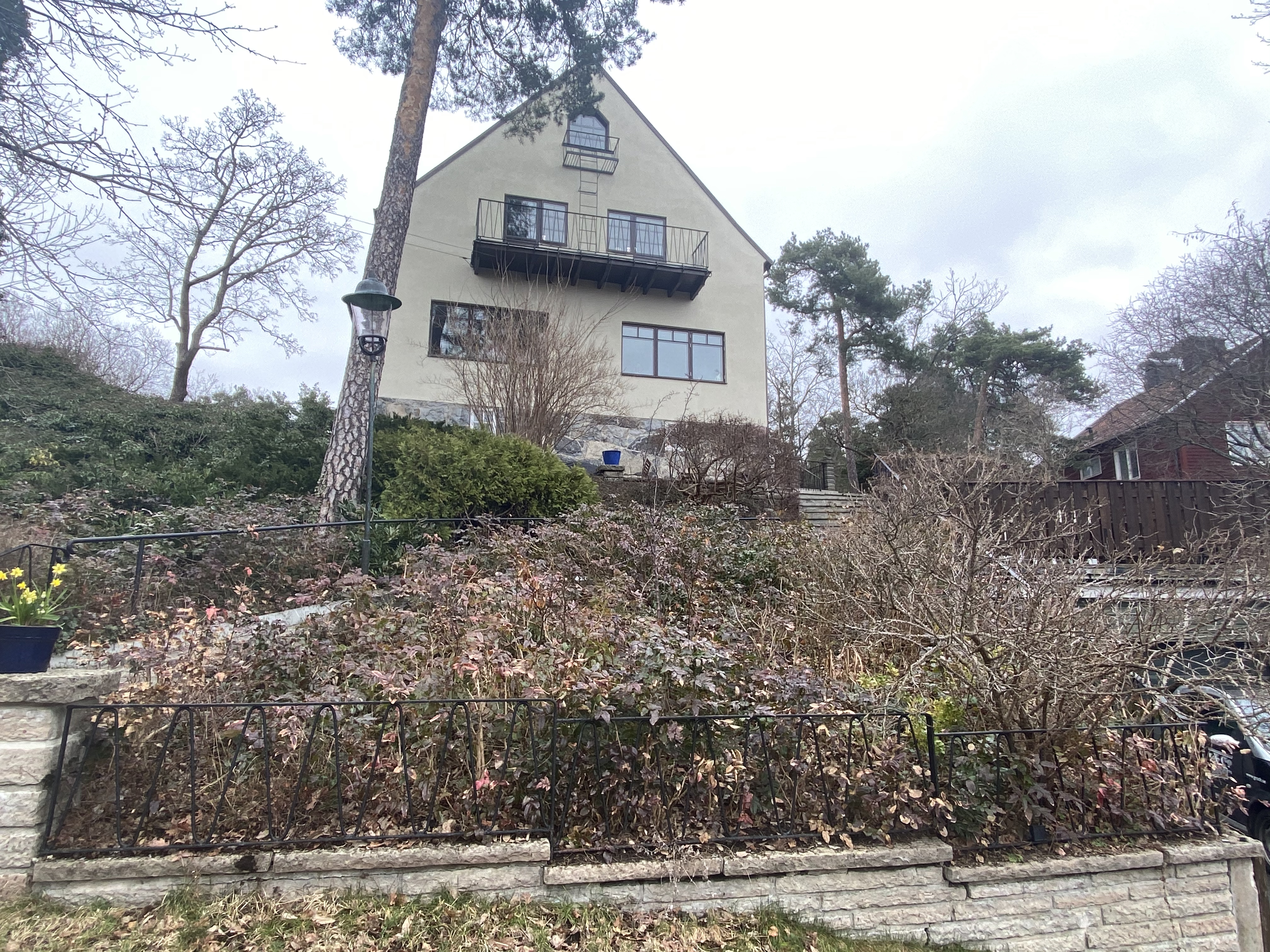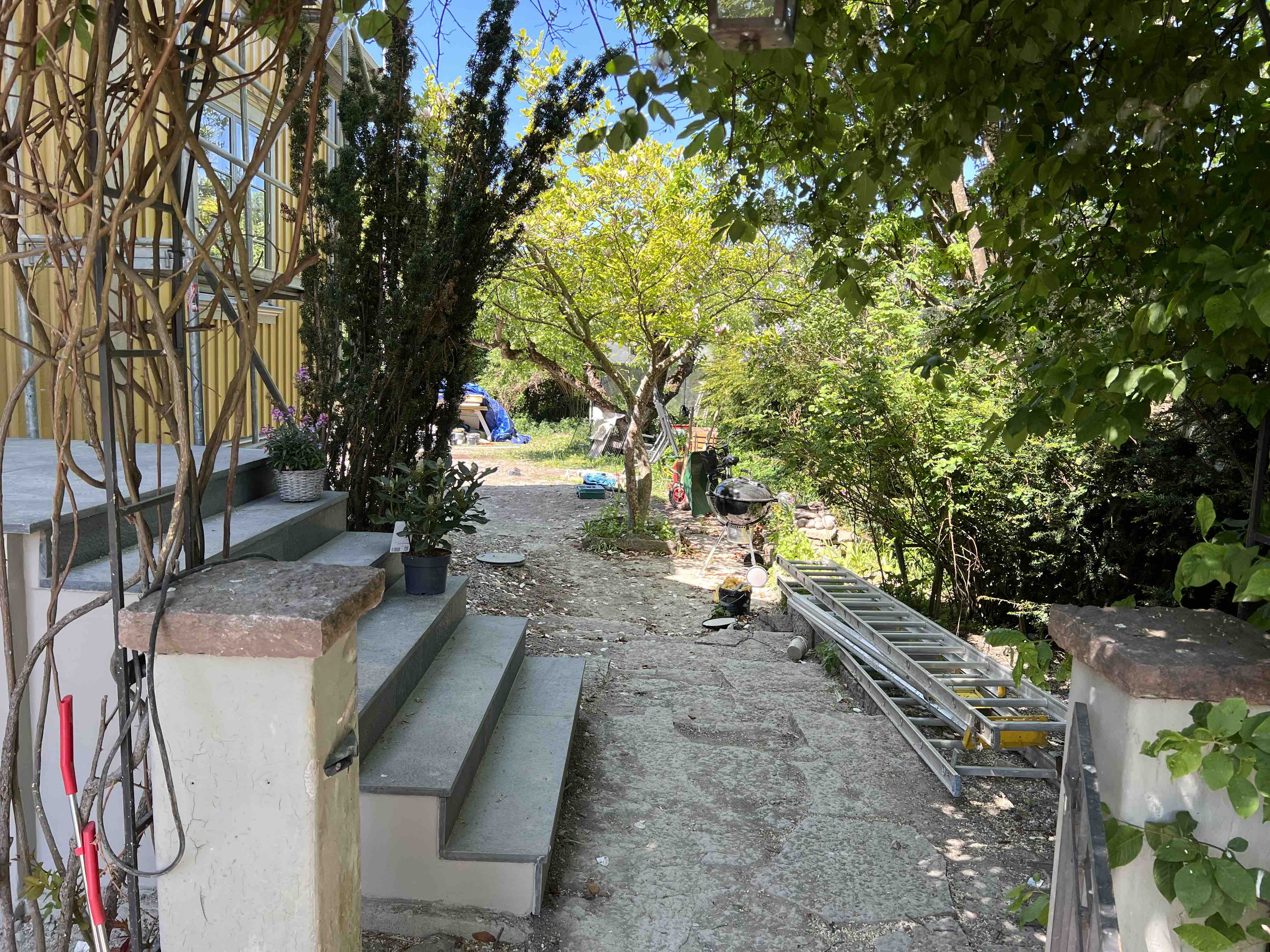 Ett gammalt men nyrenoverat hus behövde en värdig trädgård. Det fanns en hel del gömda och glömda guldklimpar i trädgården som vi försökte ta vara på. Det är dock alltid svårt att designa och plantera "runt" befintligt. Här började vi med att inventera och rulla ut en ny gräsmatta så att man kunde umgås i trädgården och så att barnbarn kunde leka.