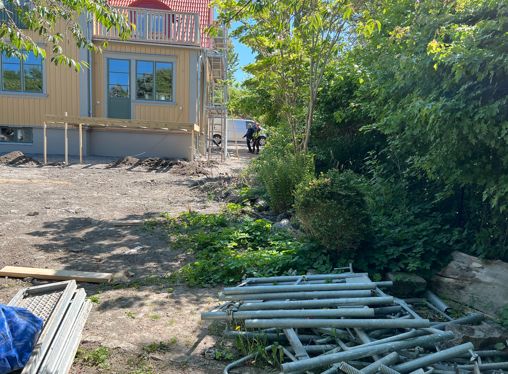 Mellan några av de få träden, på en plats som varit helt outtnyttjad, har det nu skapats en sval syrénberså med en härligt frodig klövermatta. Tänk att sitta här en varm dag och dricka läskande lemonad.