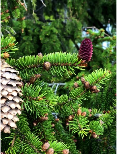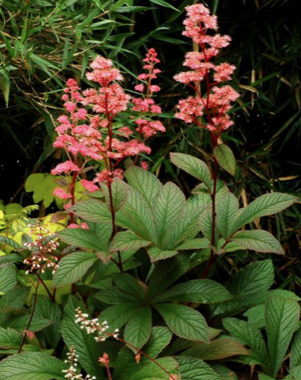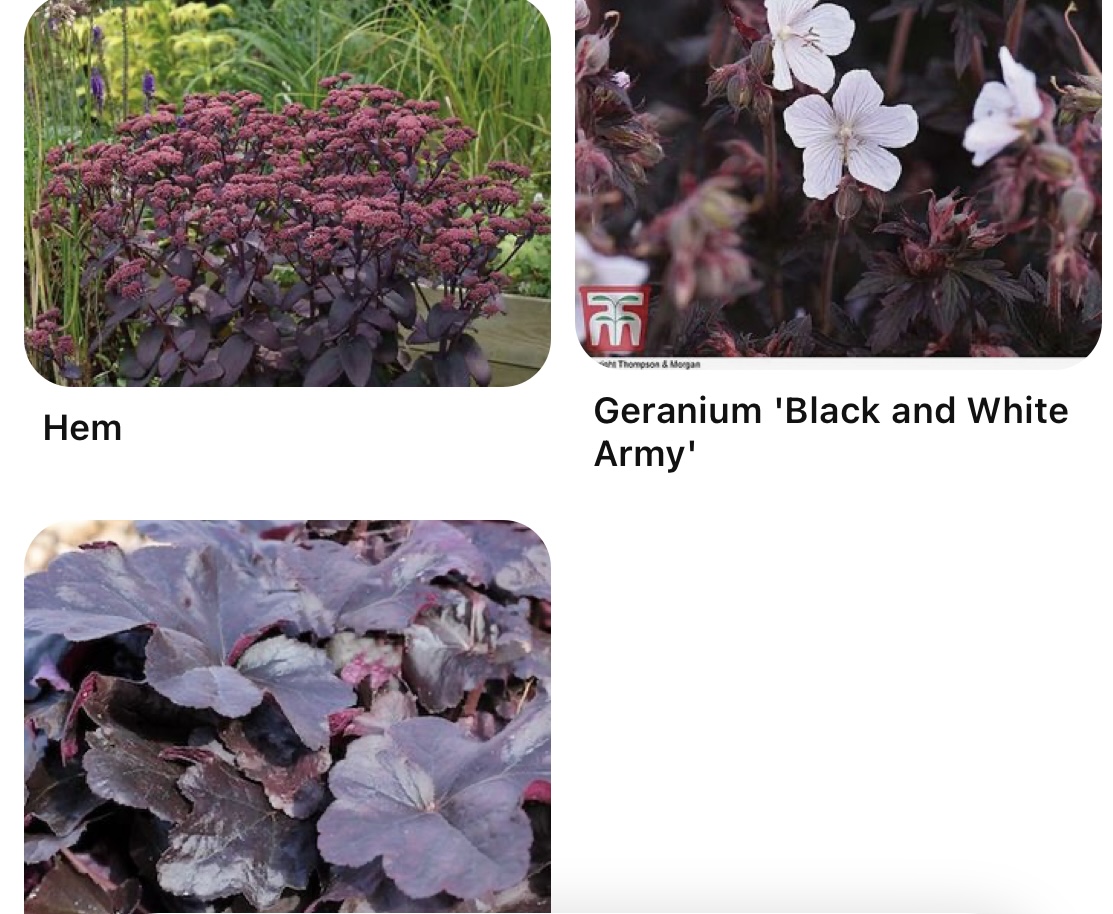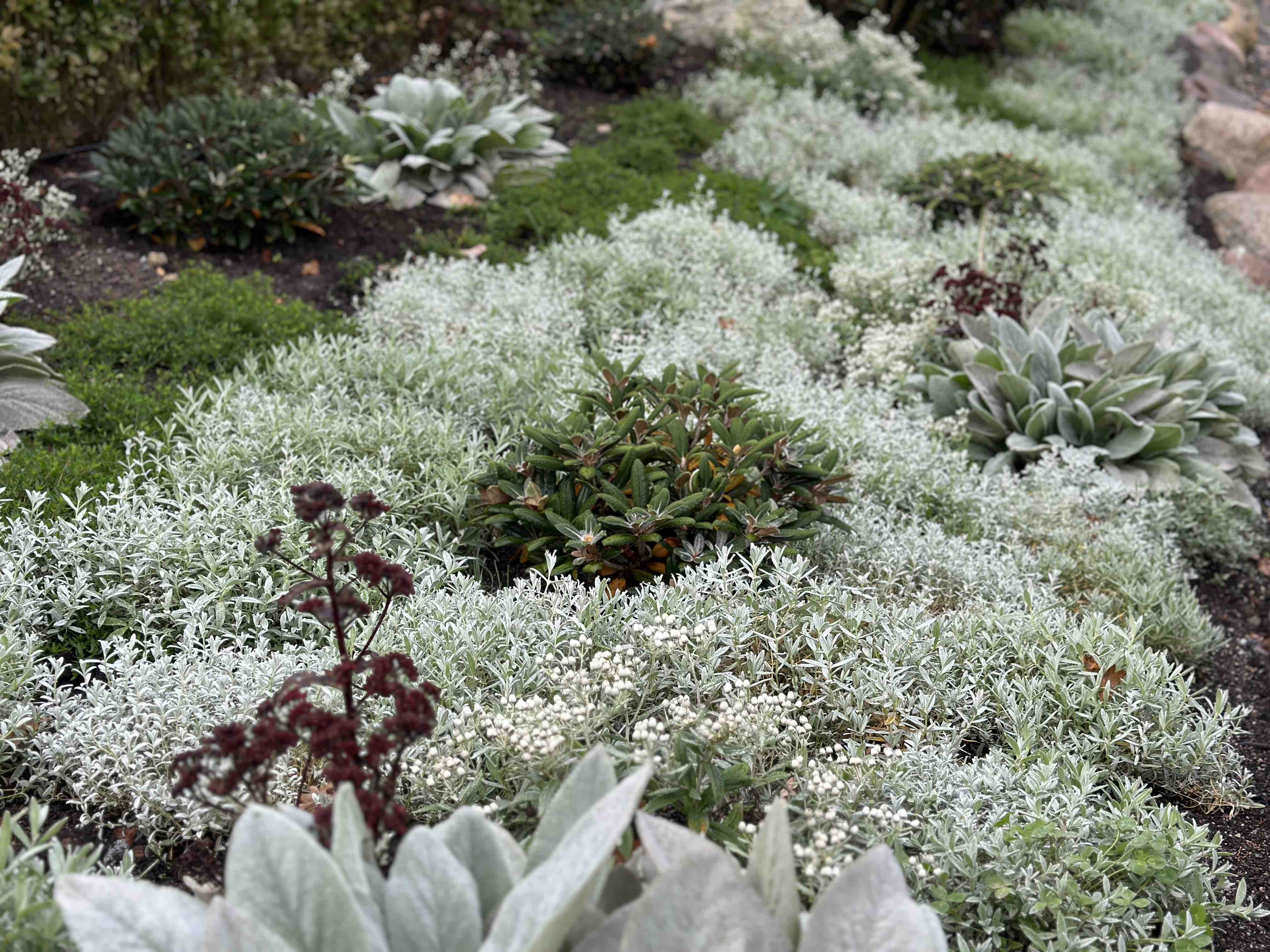 Vad gör man i en brant sluttning, där gräset är omöjligt att klippa och där man knappt orkar ta sig upp för? Med en stödmur, cortenstålskanter och en herrans massa ny jord kan man få en härlig och rätt självgående rabatt. Ett önskemålet var att färgerna skulle vara grön och mörkt inkludera grönt med mörkbladigt. Det mörka representeras här av mörkbladig fliklönn, alunrot, akleja och delvis av de mörka nerverna hos spetsmössans blad.