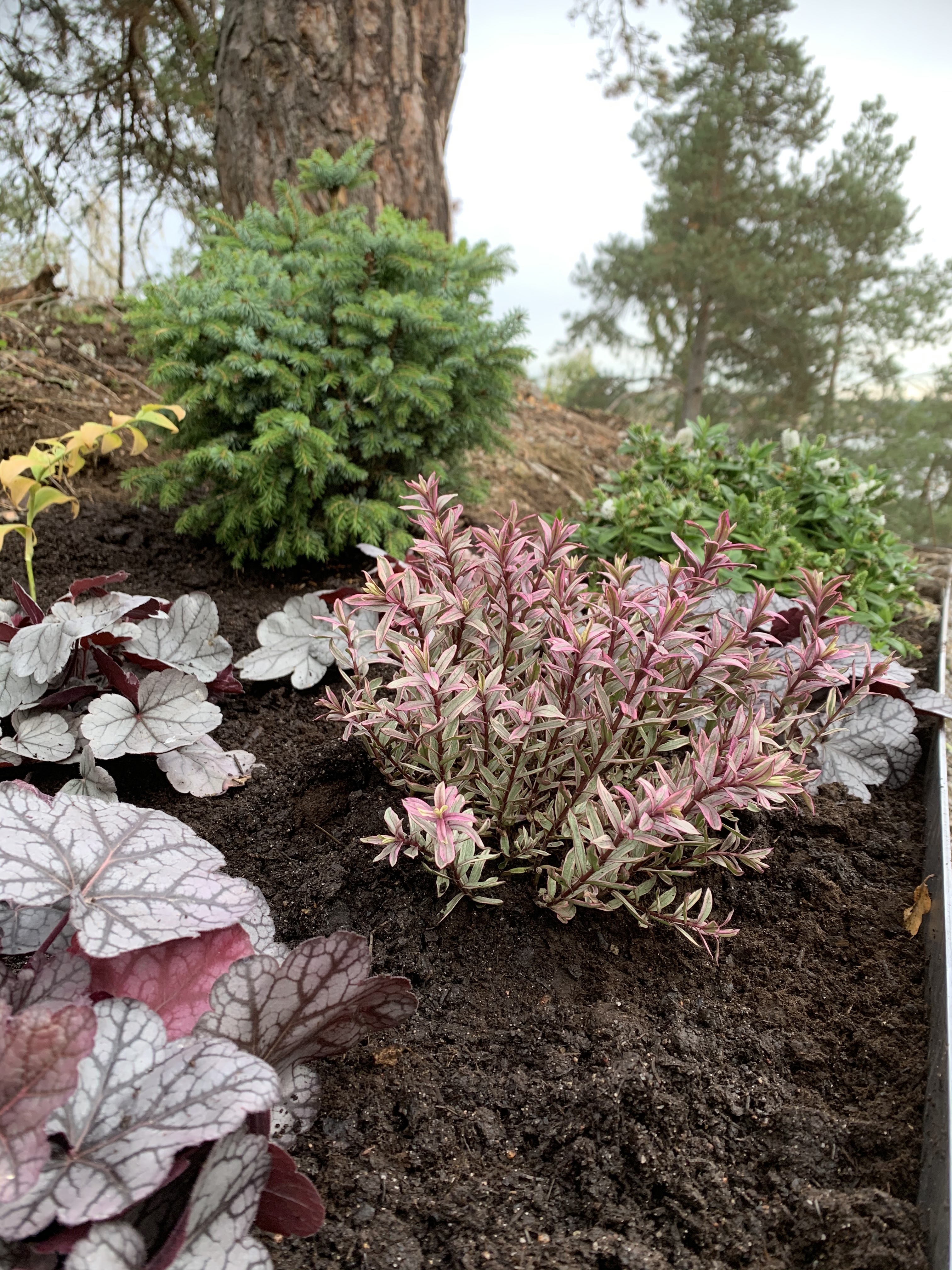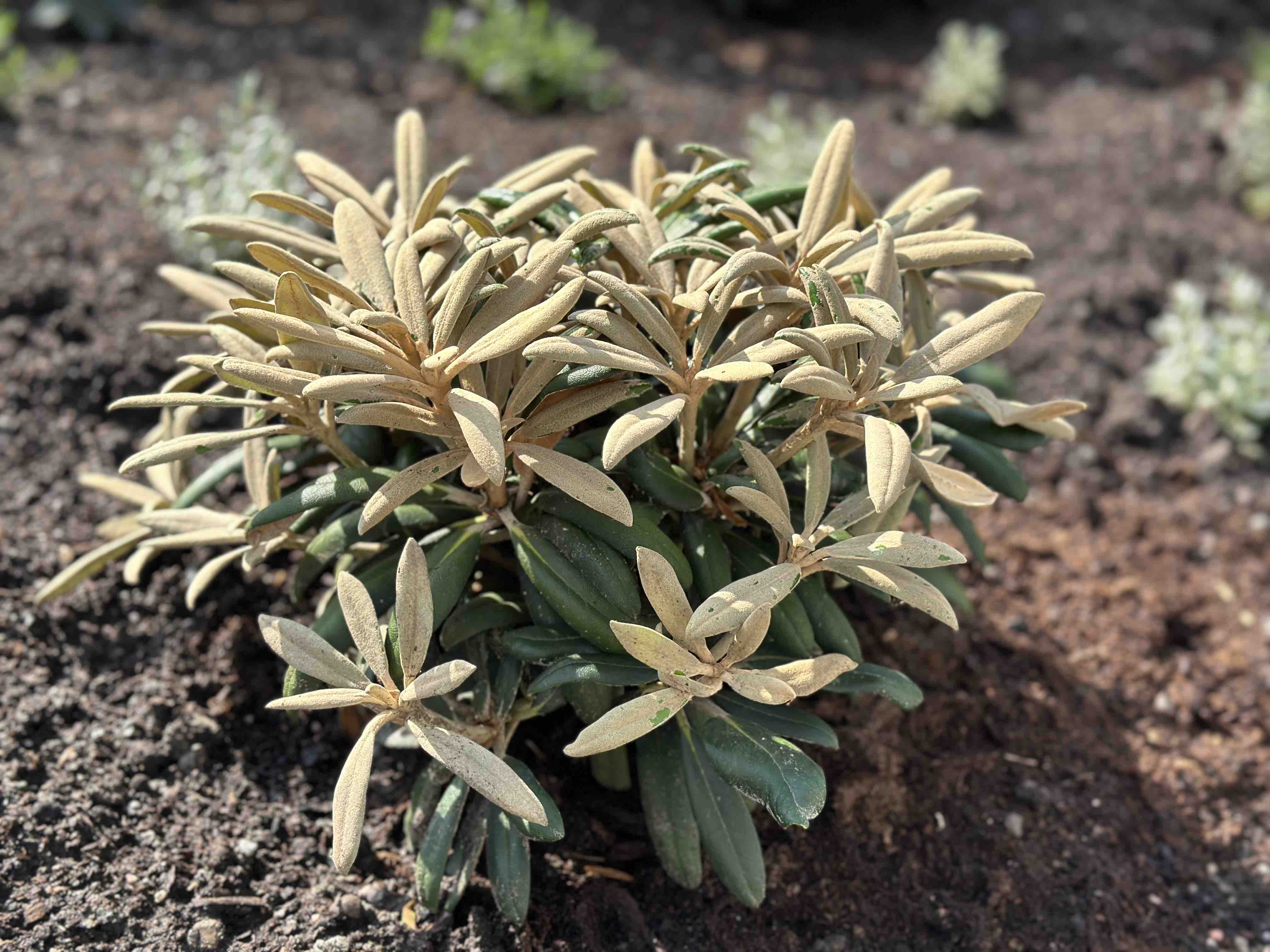 Rhodedendron 'Koichiro Wada' är en av mina favoriter med det bruna och ludna indumenet som senare försvinner när de vackra vita-rosa blommorna slår ut. Till höger är aroniahäcken just planterad.