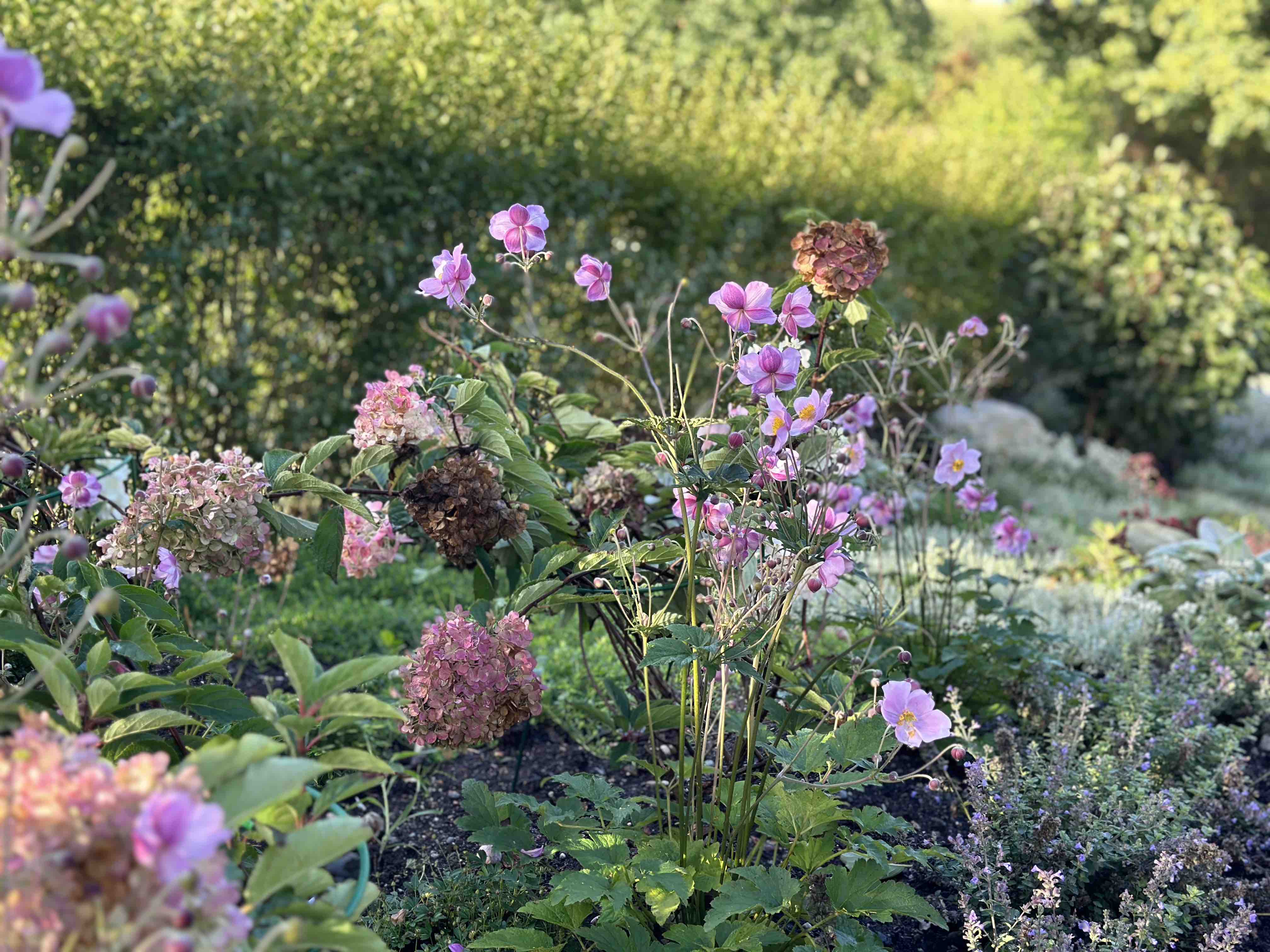 Vi försökte ta vara på den de växter som fanns, förstärka den japanska känslan de gav samtidigt som vi ville addera lite romantik! Mjuka färger råder genomgånende i trädgården med undantaget en ros och en pion.