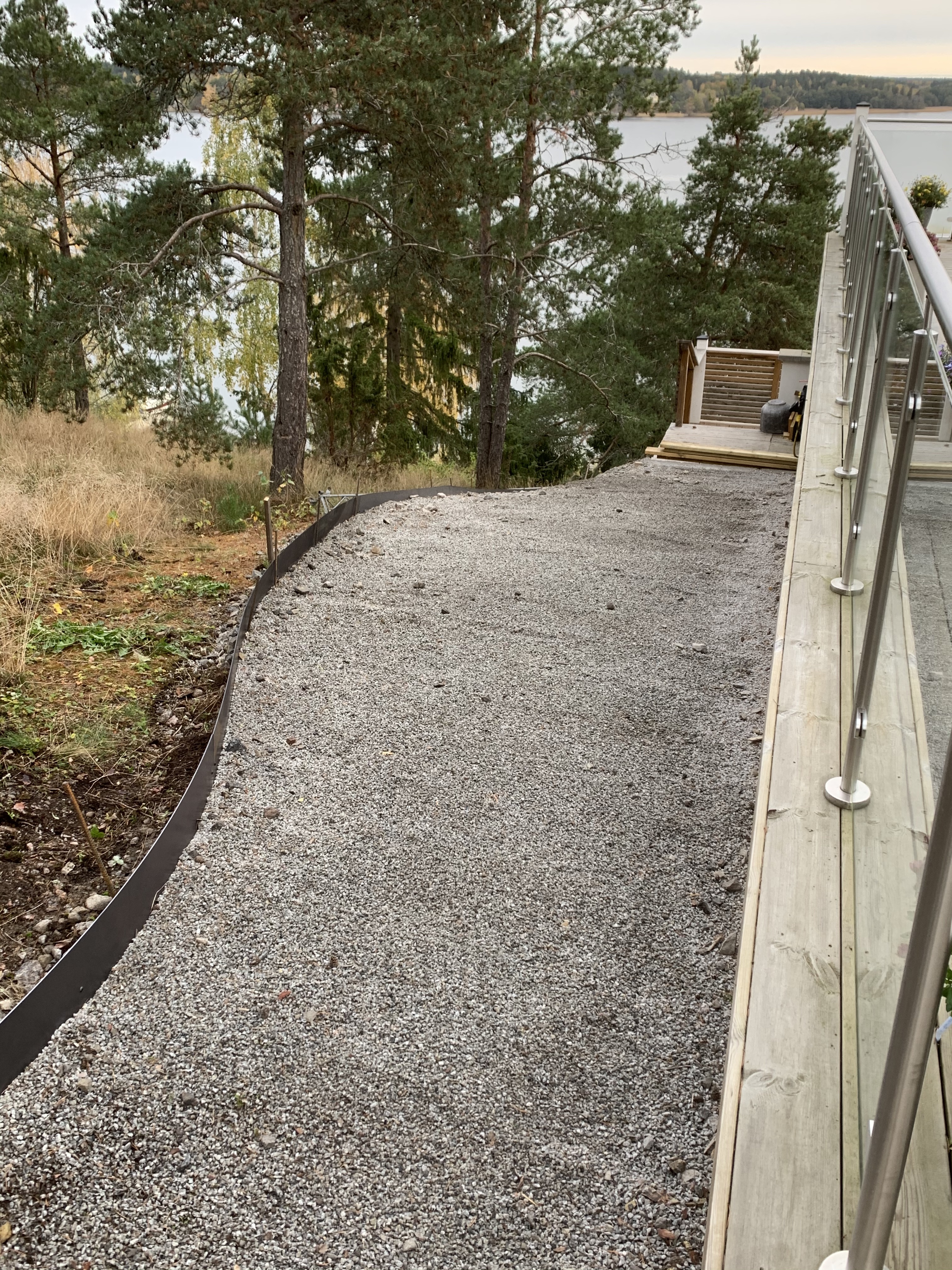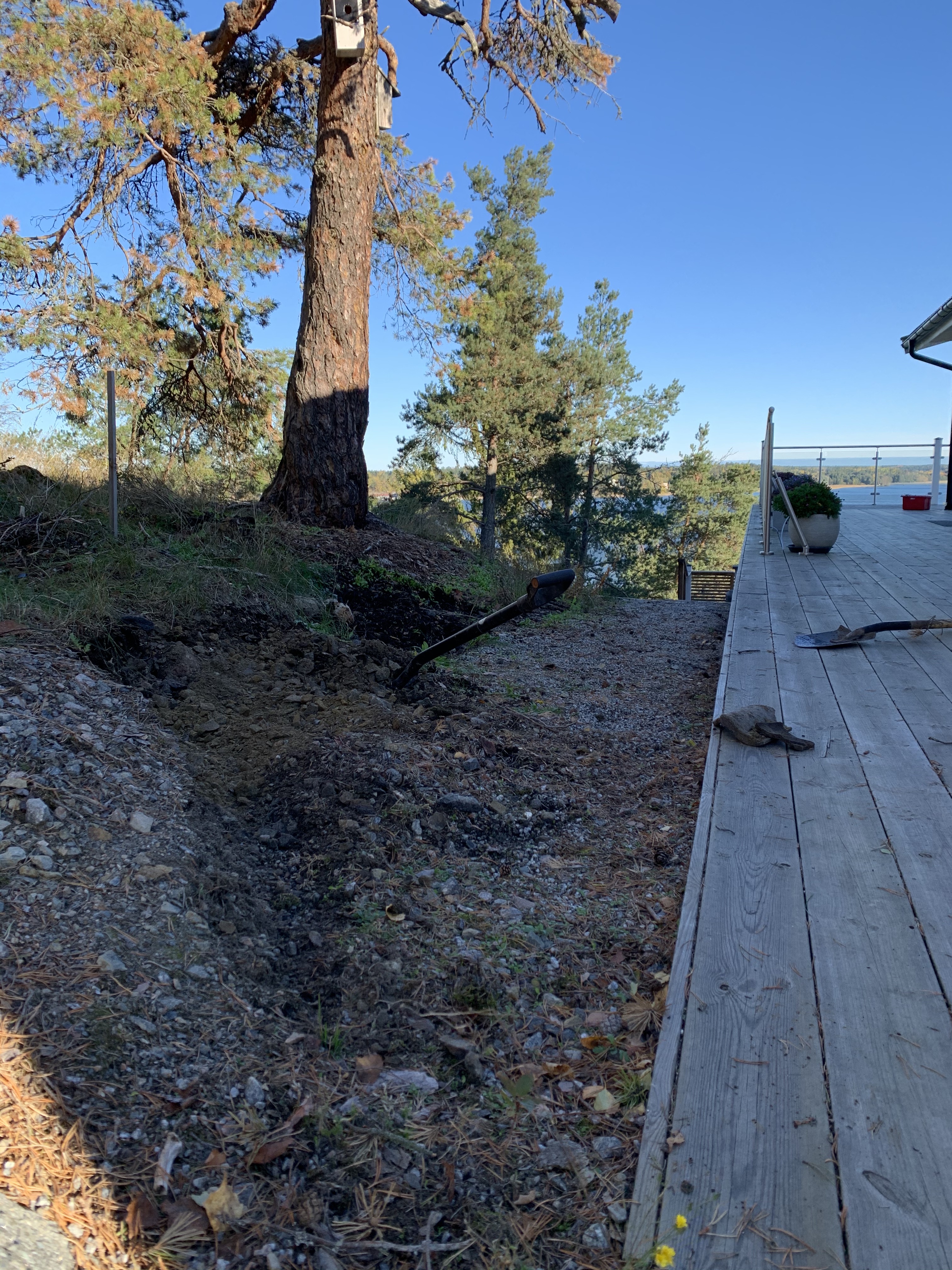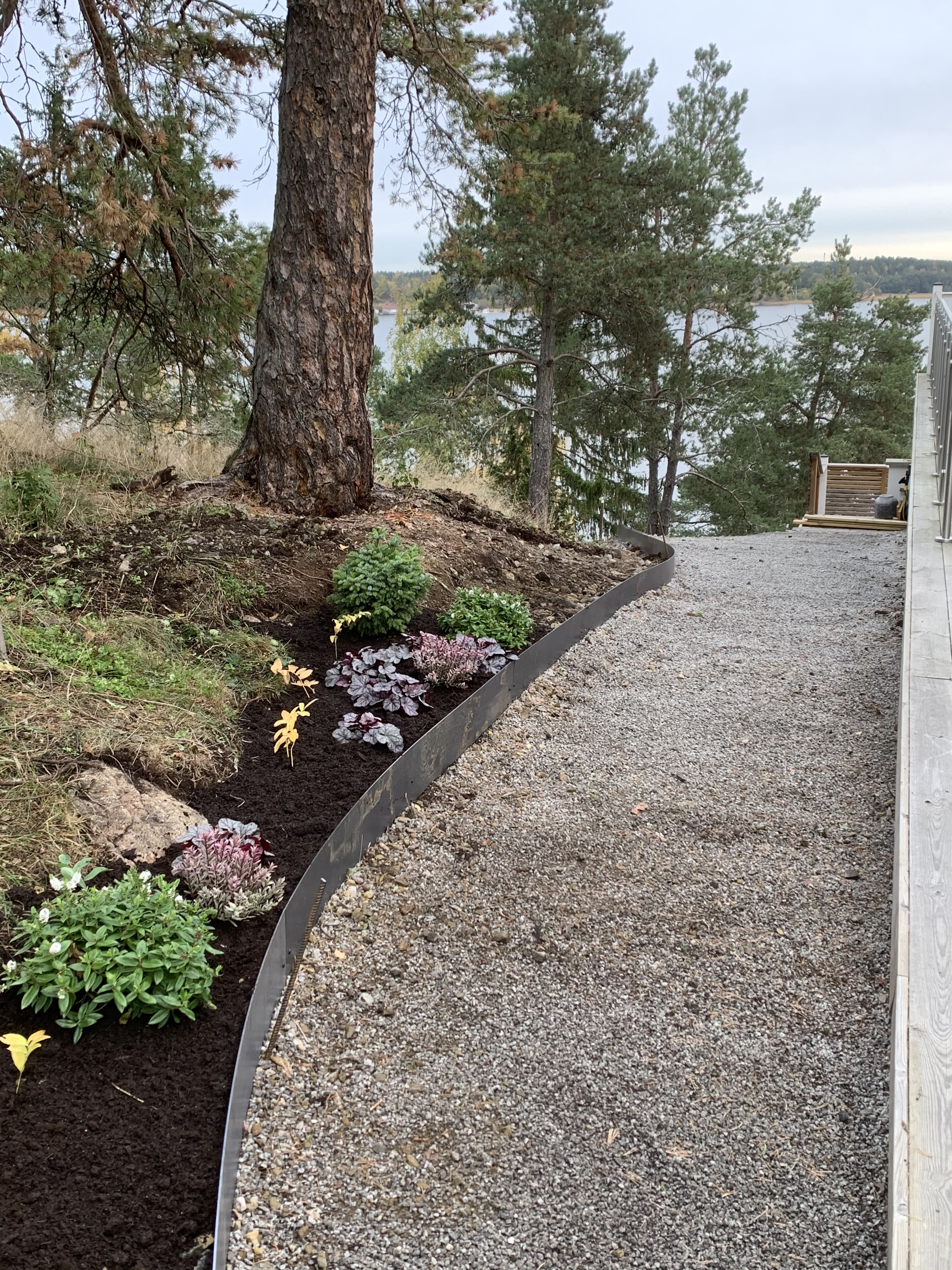 Brant! Vi handgrävde och "rullade" bort grässvålen, rensade på sten och flyttade på stenbumlingar. Att sätta stålkant i sluttning är inte heller helt enkelt så den ju inte böjer sig åt alla håll...men det gick det med. Vintergröna växter håller kvar jorden året runt, här planterade vi myrtentry, tretandsfingerört, bergenia, hakonegräs och trädgårdsnejlikrot.